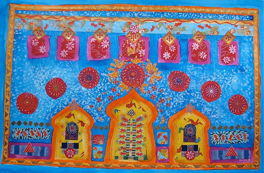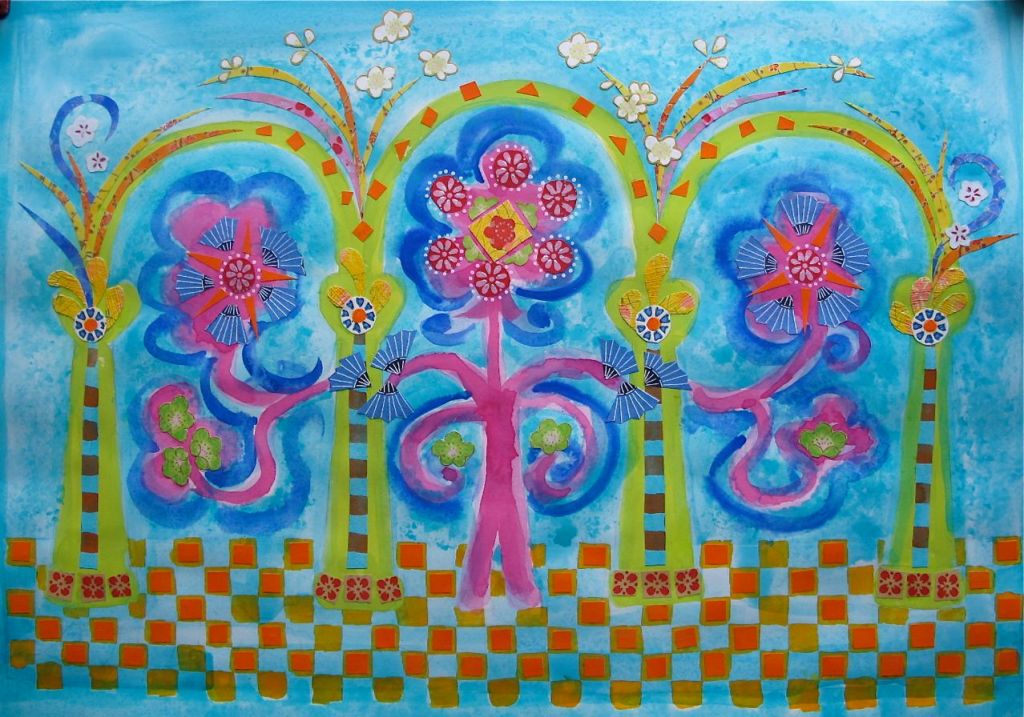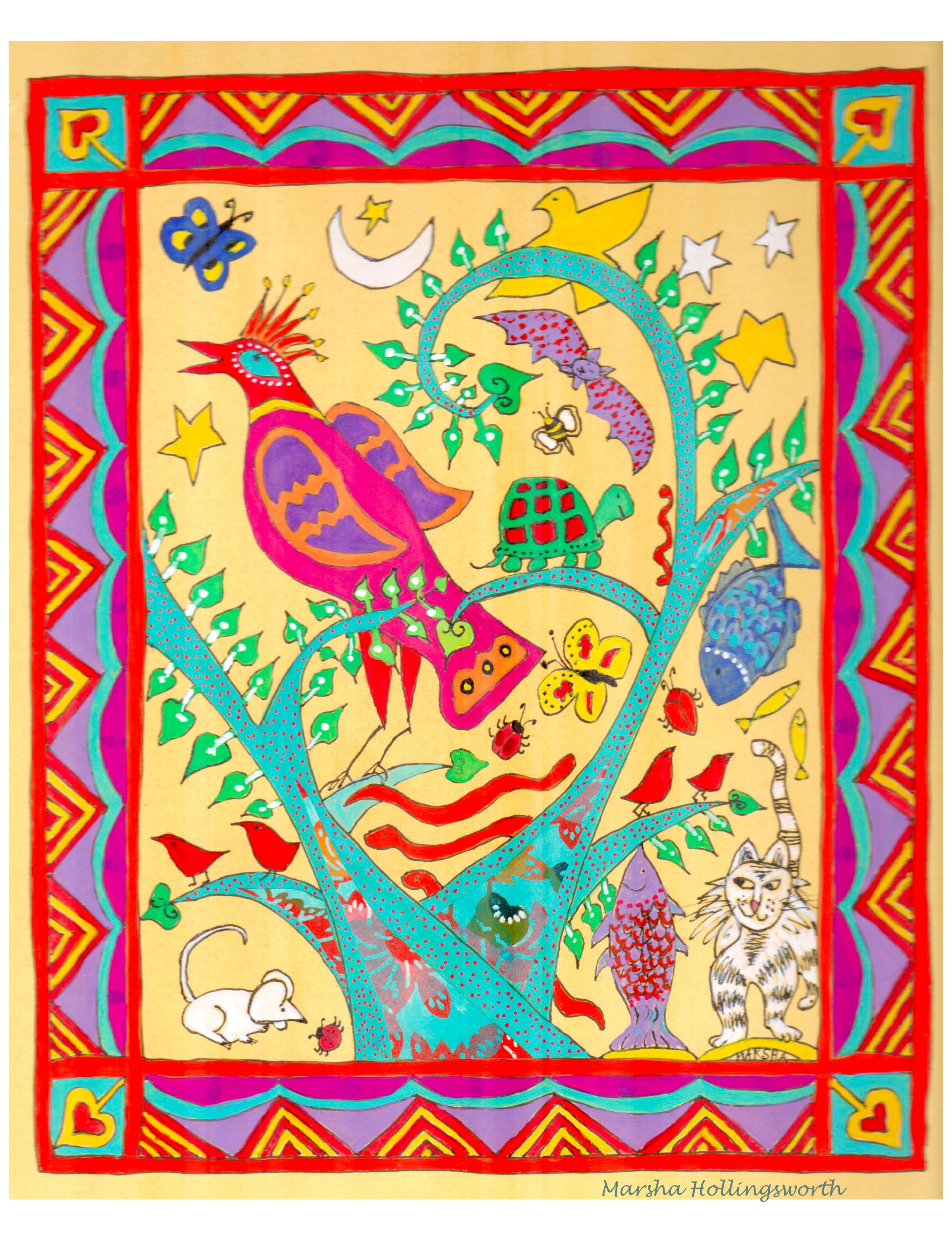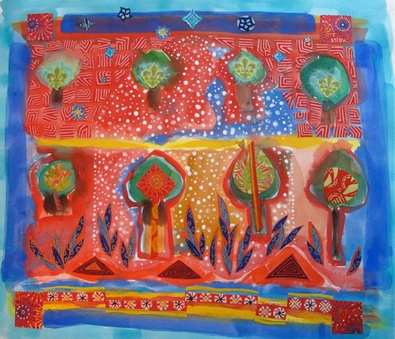 Marsha produced a collection of colorful pieces from 2012-2014. Some of her small collage pieces are overlayed on the patterns of old book covers, remnants of her life long work as a bookbinder, others are larger water colors, still others her signature work combining collage and watercolor in smaller, delightfully bright, often playful pieces. Below is a small sample of her body of work from 2012-2015. Click on each picture to see it fully.
