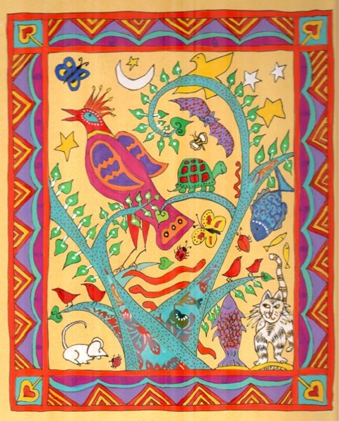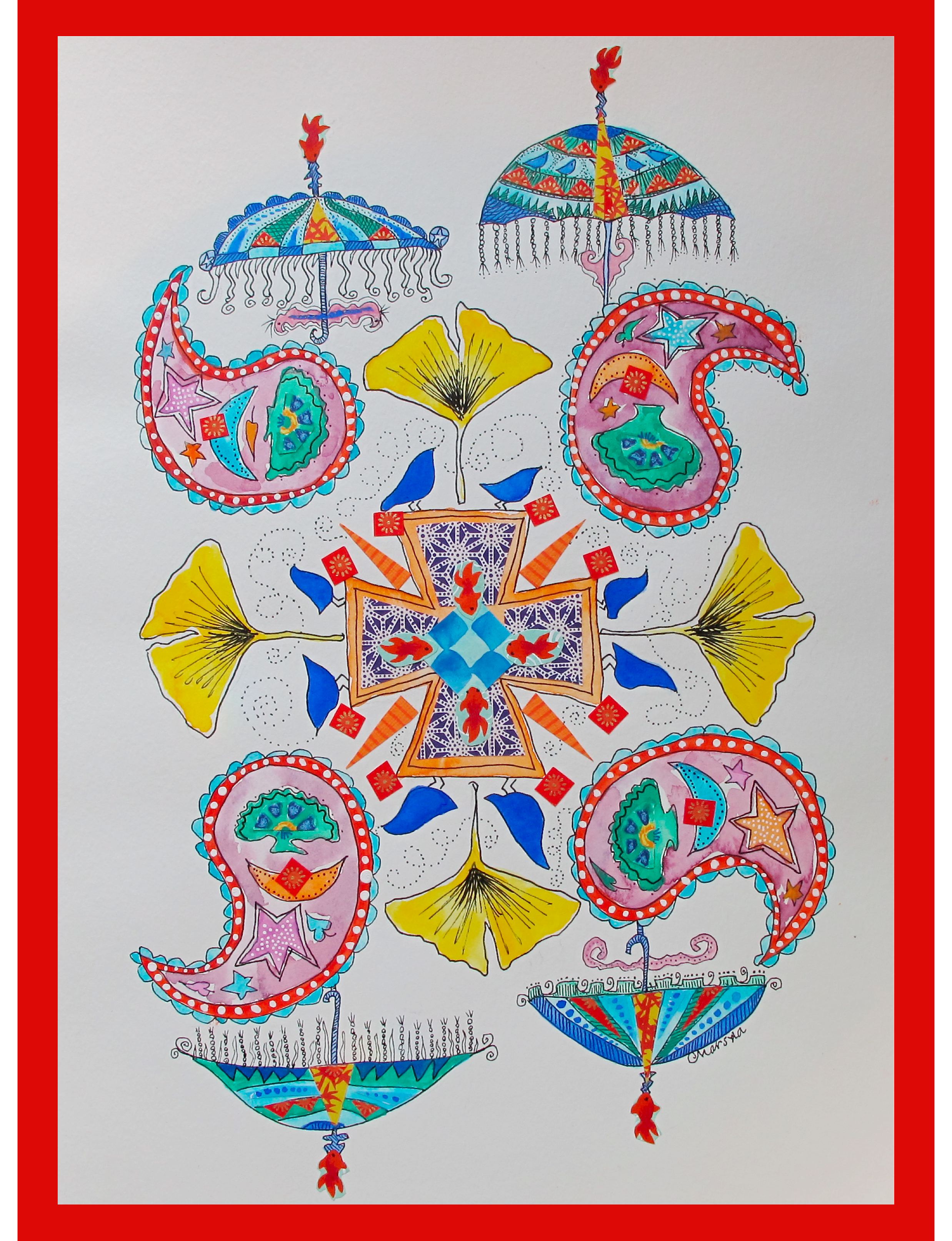 Marsha produced a collection of colorful pieces in 2012. Some of her small collage pieces are overlayed on the patterns of old book covers, remnants of her life long work as a bookbinder, others are larger water colors, still others her signature work combining collage and watercolor in smaller, delightfully bright, often playful pieces. Below is only a sample of her body of work from 2012. As with many of the pieces on this website, these newer pieces are for sale. Contact the artist to inquire about prices or to see more of her new work.