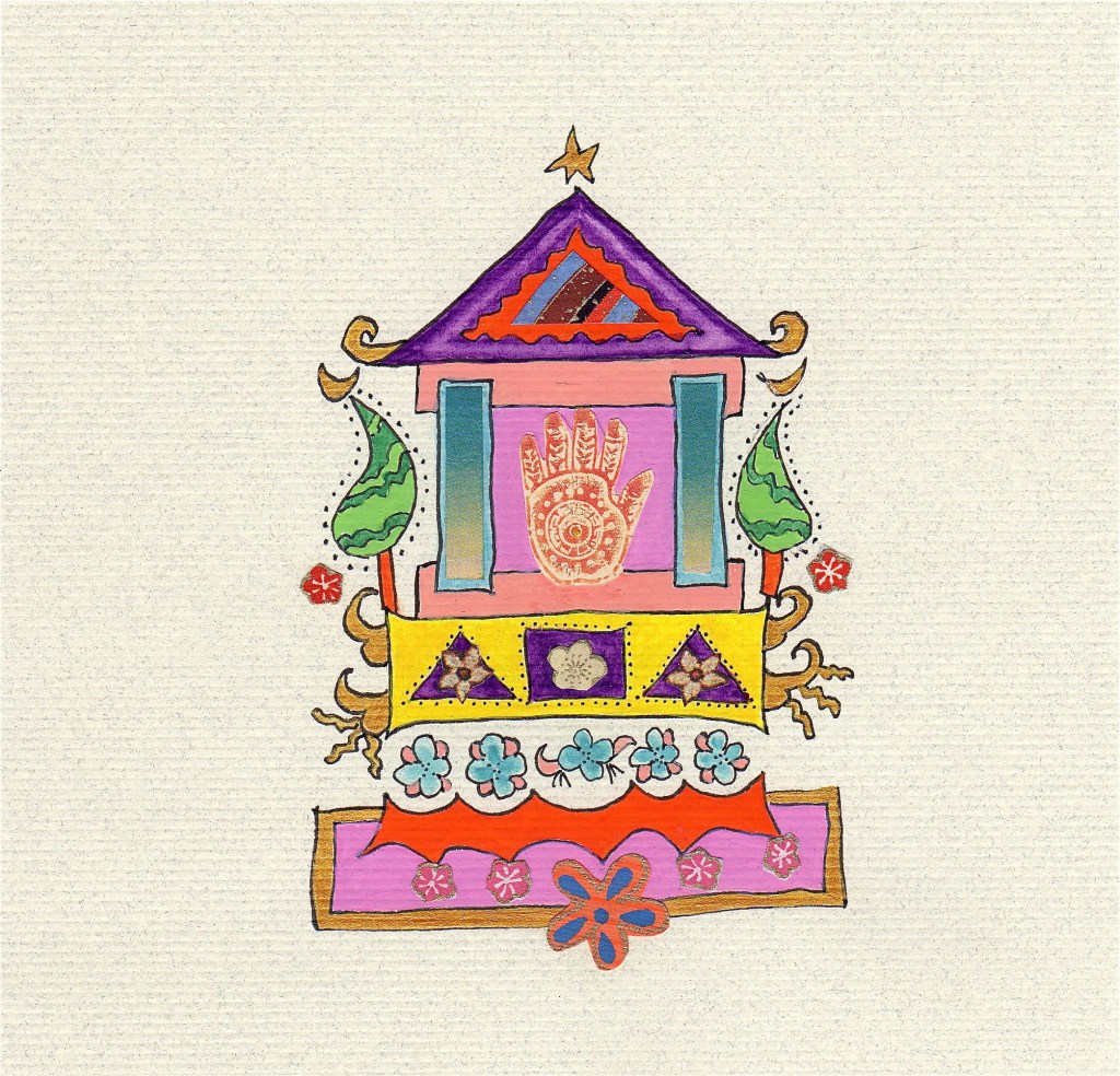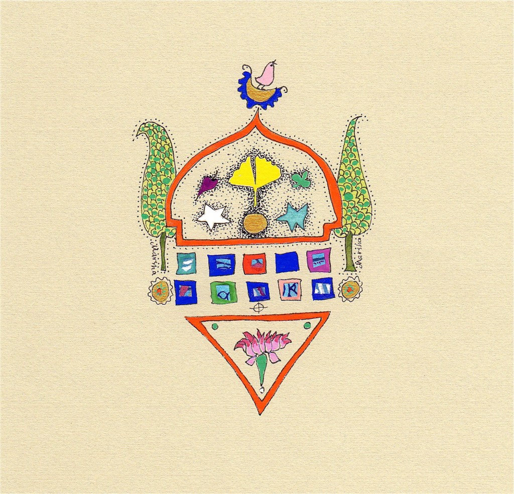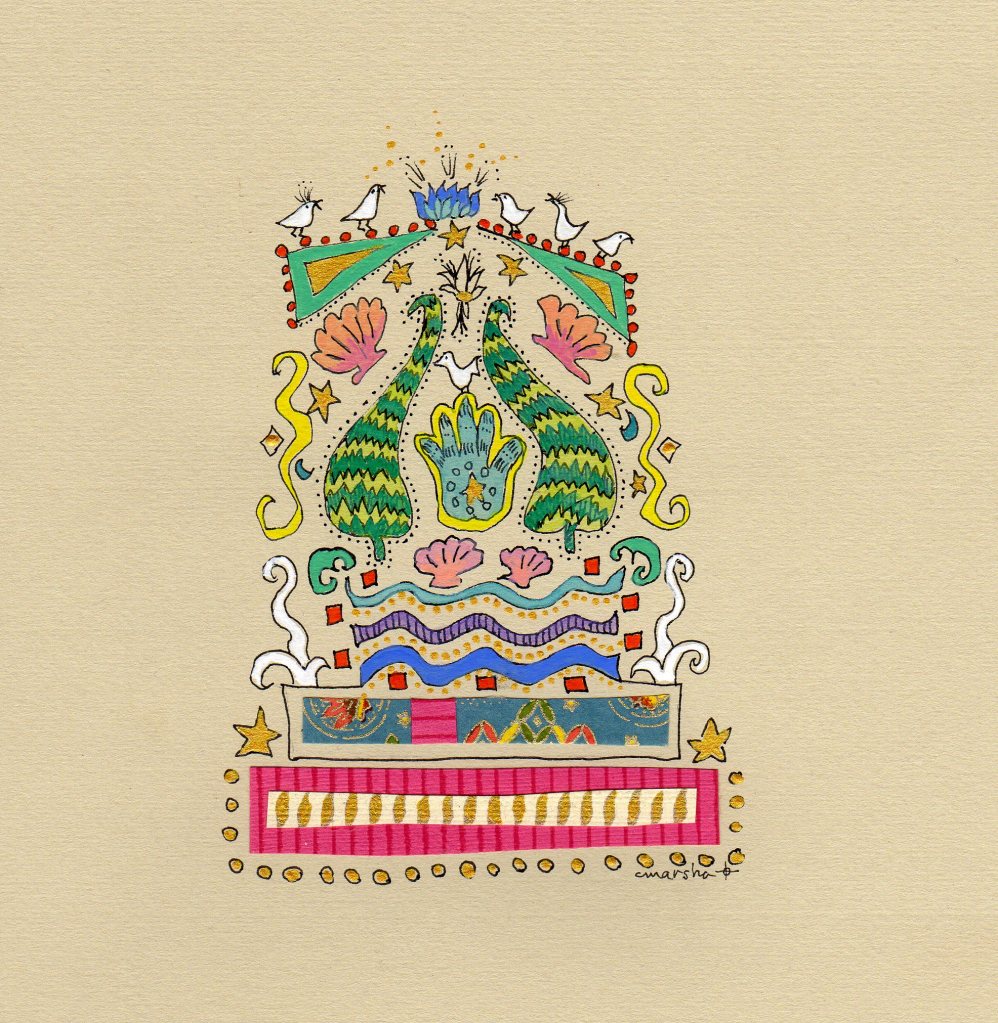 These small 4” x 5” collages are done in ink, gouache, acrylics, and stamp on Asian papers.