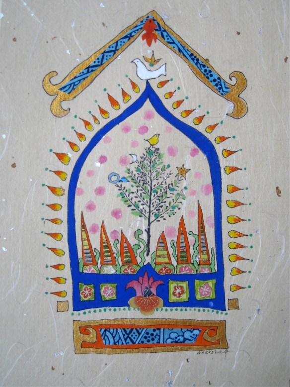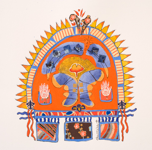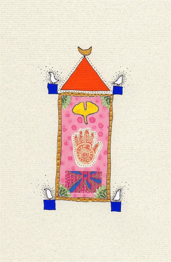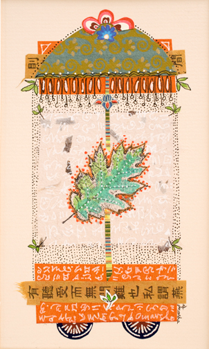 These small 4” x 5” collages are done in ink, gouache, acrylics, and stamp on Asian papers.